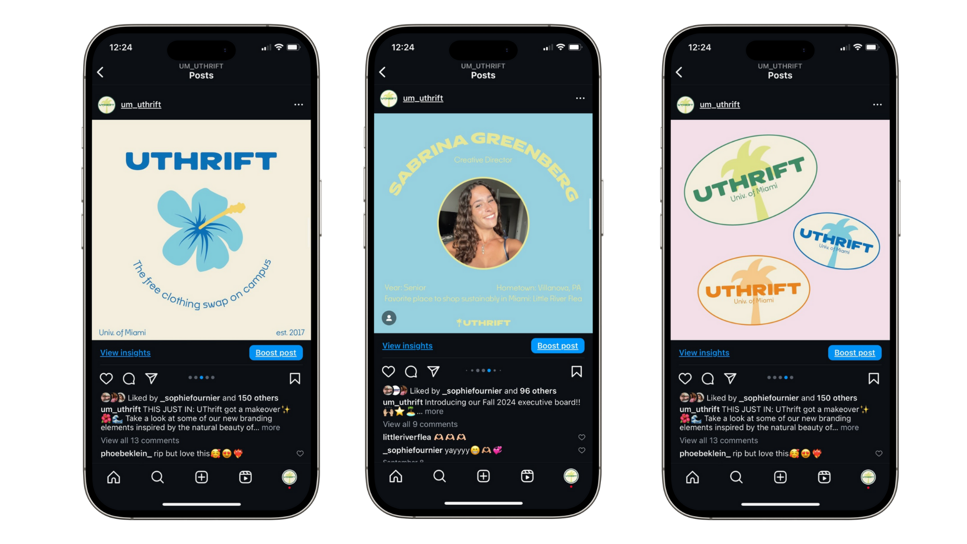 Nothing gets me quite like a good thrift find, which is why I’ve spent much of my college career as the Creative Director of UThrift, the University of Miami’s free thrift swap. With this redesign, I was looking to give our brand a more vibrant, contemporary look and feel while drawing inspiration from the natural elements of the Miami environment.