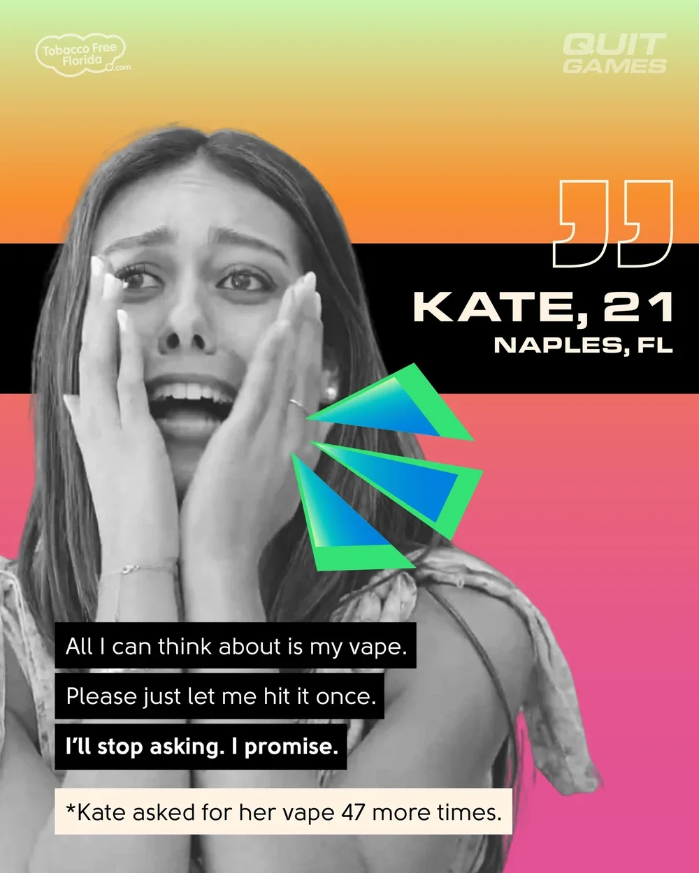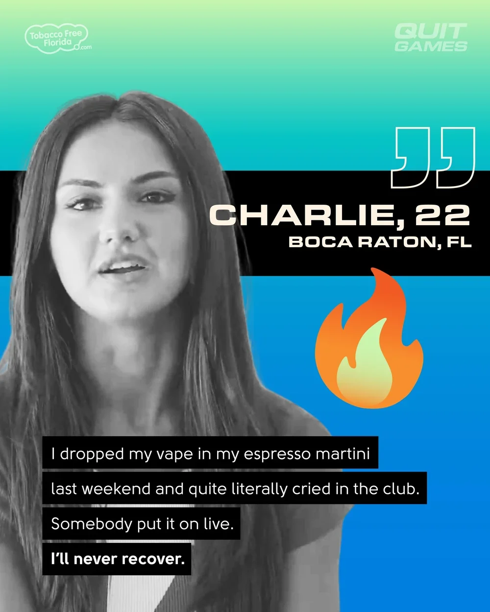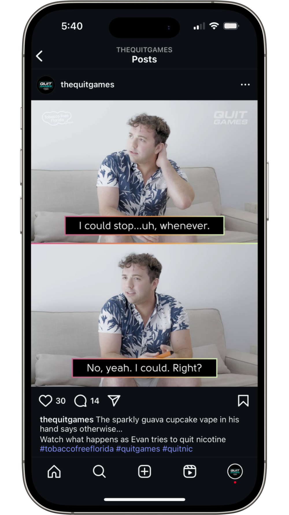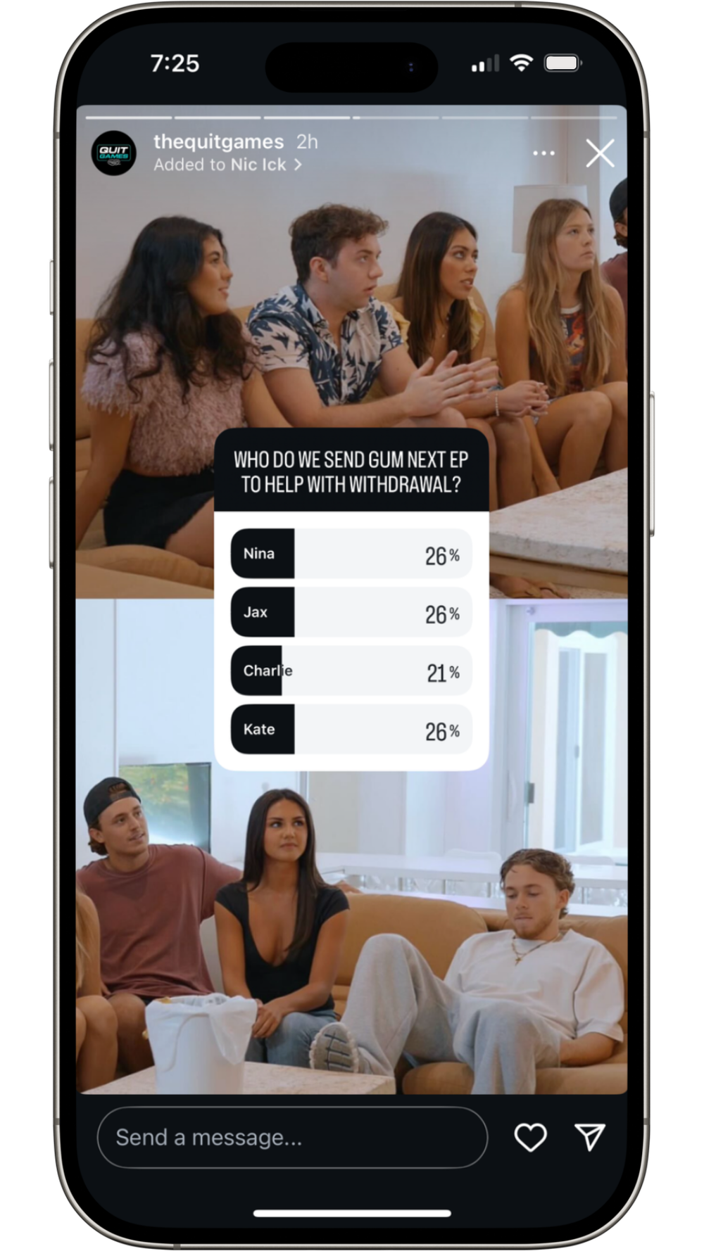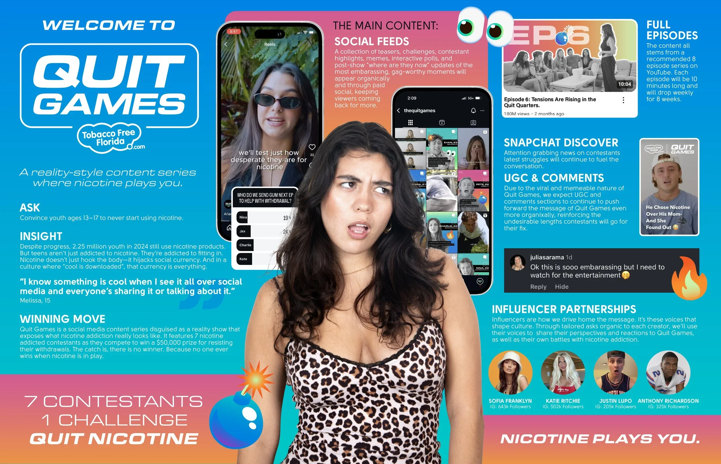 Idea Infiltrate teen culture with Quit Games, a dramatic social media content series disguised as a reality competition show that exposes the embarrassing realities of nicotine addiction.